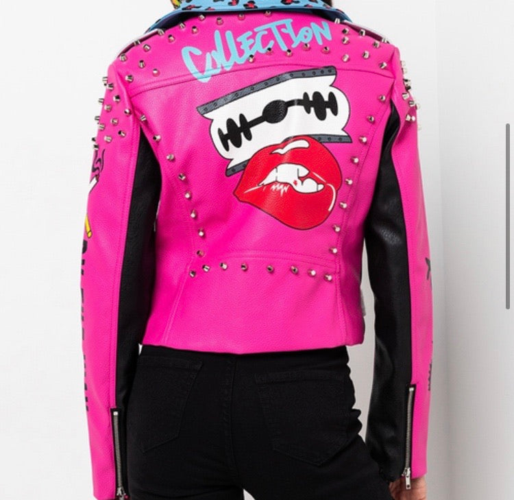 Pink & Black Faux Leather Jacket with Blue Leopard Collar