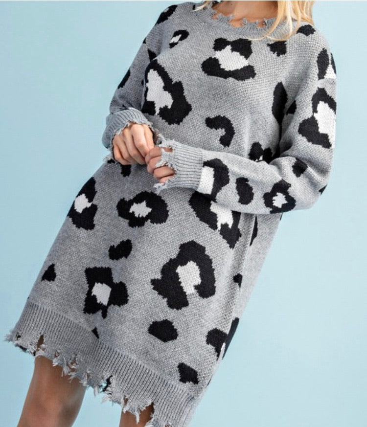 “Sarah” Grey Leopard Sweater Dress